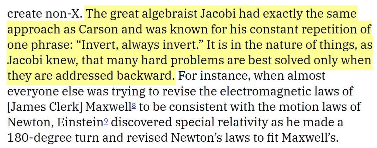 In most problems where uncertainty reigns, it can be very hard to reach an extremely desirable solution. In this kind of situation, an excellent heuristic is to invert the problem and avoid undesirable outcomes rather than trying to find the extremely desirable ones.