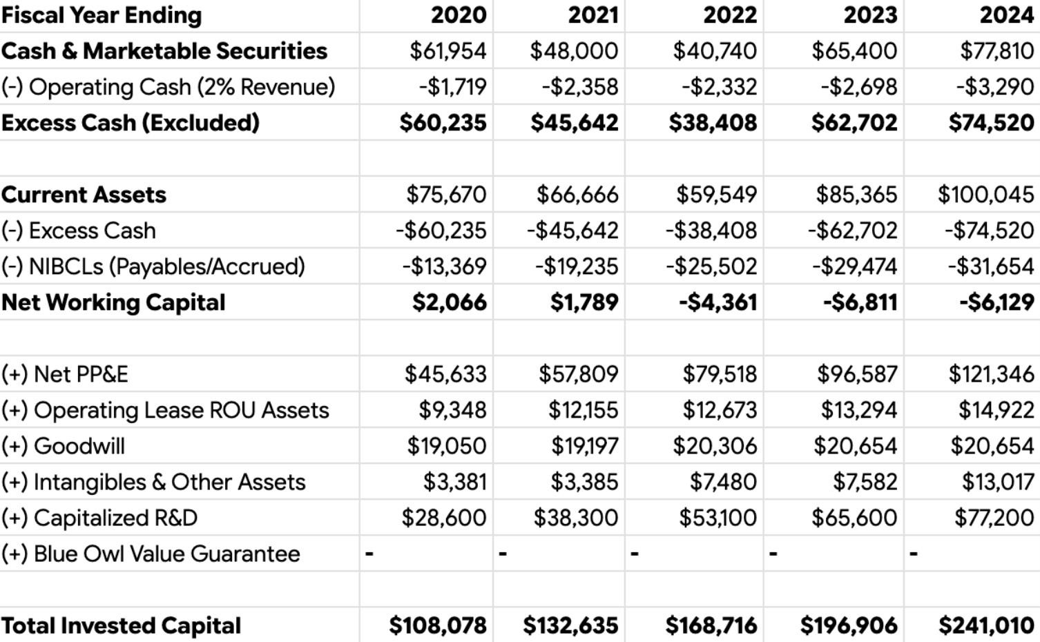 In terms of the invested capital issue with capital light companies like software and pharmaceuticals, Yefei Lu discusses how to add back accumulated amortization in the book, Inside the Investments of Warren Buffett. That said, I think you handled it well in the META example.